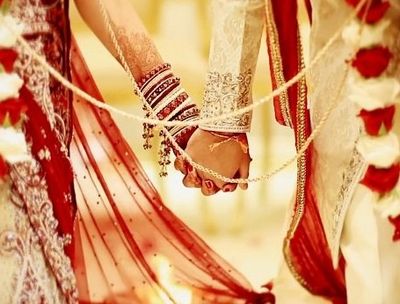 (Marriage Vows and Declaration) Holding the holy fire as witness, Groom holds Bride's hand and both clasp their hand firmly. In this ceremony they vow to be responsible for each other and declare together: